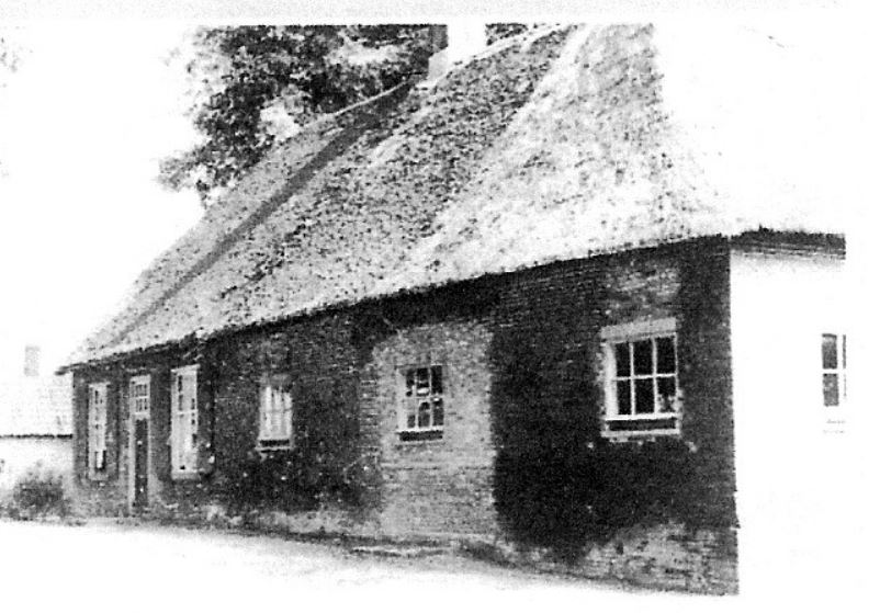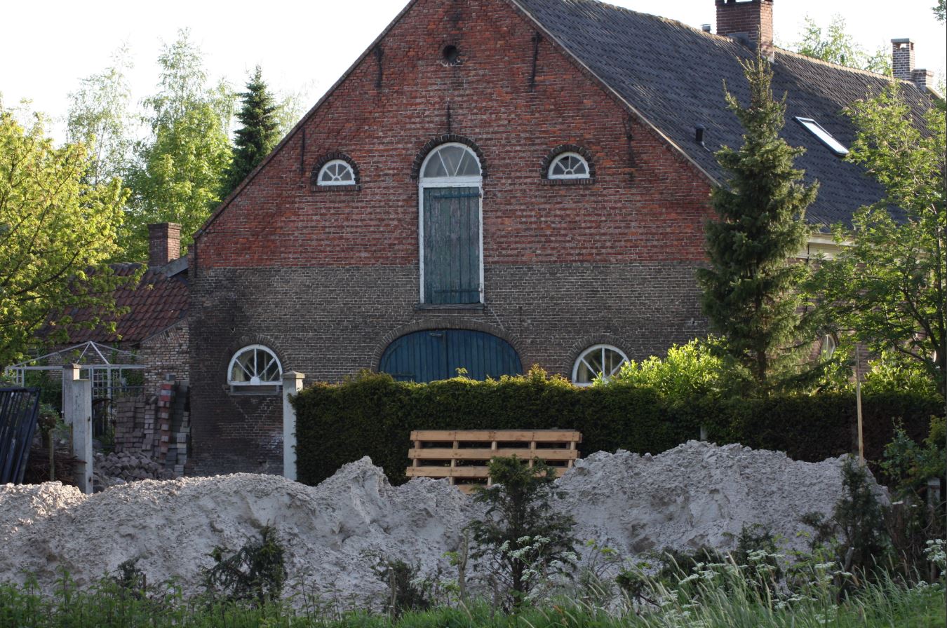 Alleen de halfronde deur naar de voormalige koeienstal /werktuigenschuur, is dichtgemetseld en het rieten dak is ook hier vervangen door een pannendak.